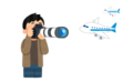 • 例えば飛行機ならば移動してくる飛行機が通る(だろう)場所、あるいは上空を通る場合は(これ、実際は難しいのですが)概ね高さを想定し、そこの距離あたりにある目印に合わせる