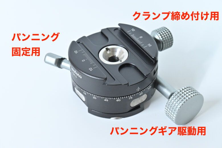 また、クランプ締め付け用、パンニングのギア駆動用、パンニング固定用の各ノブの形状はそれぞれ異なるので誤操作のリスクも少ないです。