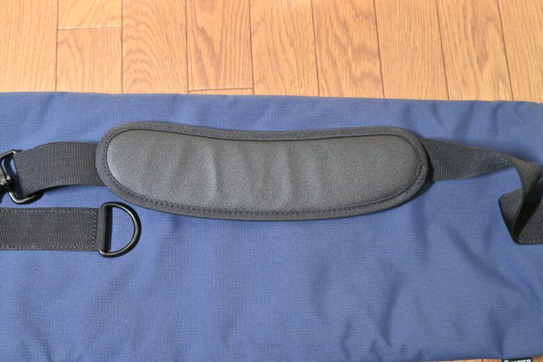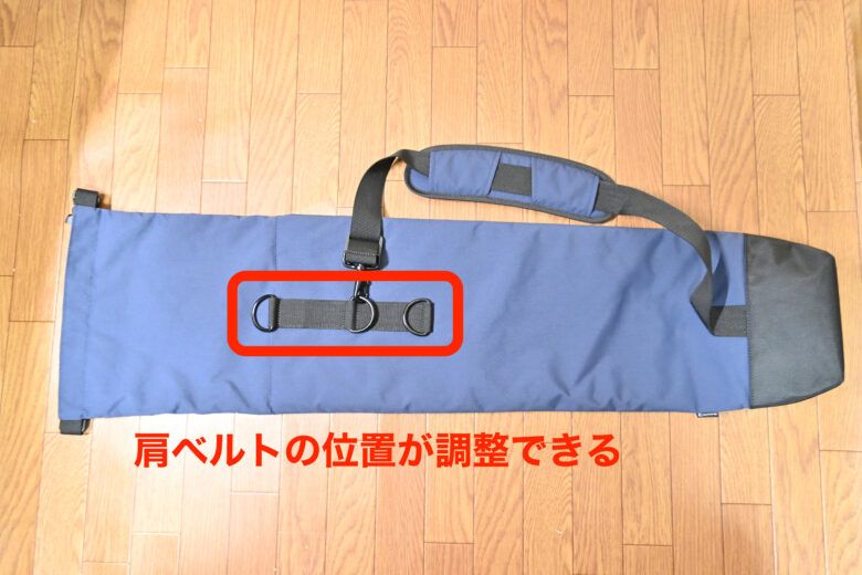 肩ベルトを中心に、最下部はポシェット型、最上部は三脚に巻き付けるだけ というシンプルな構成です(ちなみに私のモデルはネイビーです)。