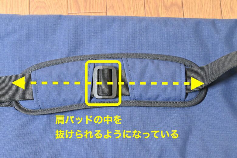 肩掛けベルトの長さを調整した際、長さの調整用の部材が肩掛けパッド内を通過できるよう配慮もされています。