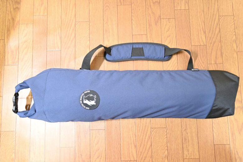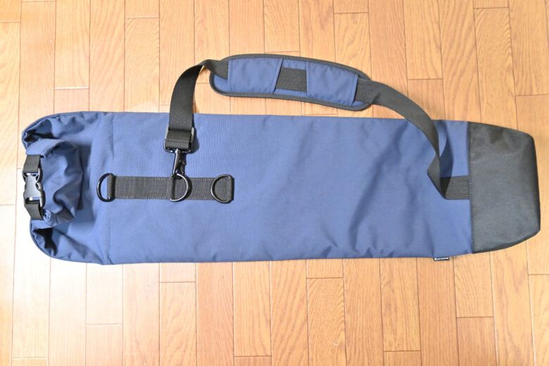 最上部が開放され、三脚の全長の応じて上部を丸めるタイプ(ロールトップ)の三脚ケースで、最大82cmの全長の三脚まで対応しています(ちなみに私のモデルはインクブルーです)。