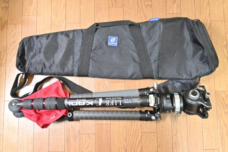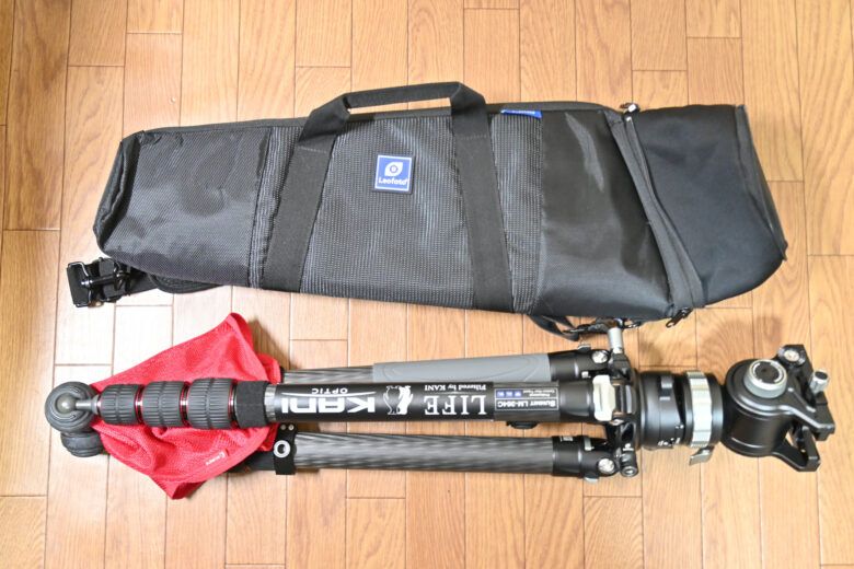 このため、同梱のLeofotoの三脚ケースは10cmほど全長が拡張ができますが、拡張を行なっても全く三脚がケースに入らない状態です。
